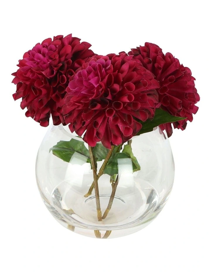 The Plum Dahlia Arrangement features a dazzling display of colour with 3 huge deep burgundy dahlia sprays in a round glass vase. The dahlia flowers have meticulous and intricate folds and the colour is astoundingly vibrant.Β This arrangement is eye-catching no matter where you choose to display it.