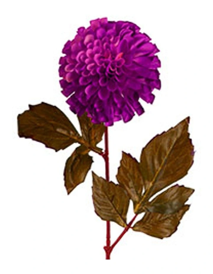 This Dahlia stem features a gorgeous ball shaped Dahlia flower in stunning red. The numerous intricate folds combine to create a visually striking flower, which are accentuated by the jagged edge leaves with vein detailing.
