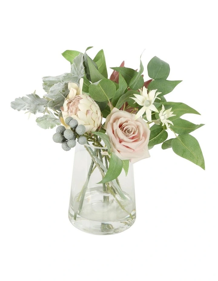 Packed full of variety, this colourful arrangement features large cream and pink roses and proteas as the centerpiece with various distinct leaves. The flowers have intricate folds for added depth and texture, while some of the leaves are flocked for an exciting velvety feel. The light colouring mean this arrangement is versatile enough for use in many places like a side table or mantlepiece.