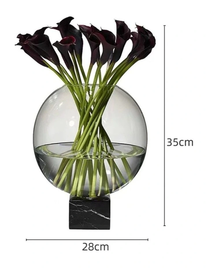 Exclusively Designed by Vicky Yao- Artificial Dark Purple Calla Lily Arrangement with Fake Water in Glass Vase on a Marble Base. This is a very simple but luxury artistic arrangement sure to please. The arrangement is about 25cm in width and 35 cm in height. PU leather Flower and a Real Marble Base.Β