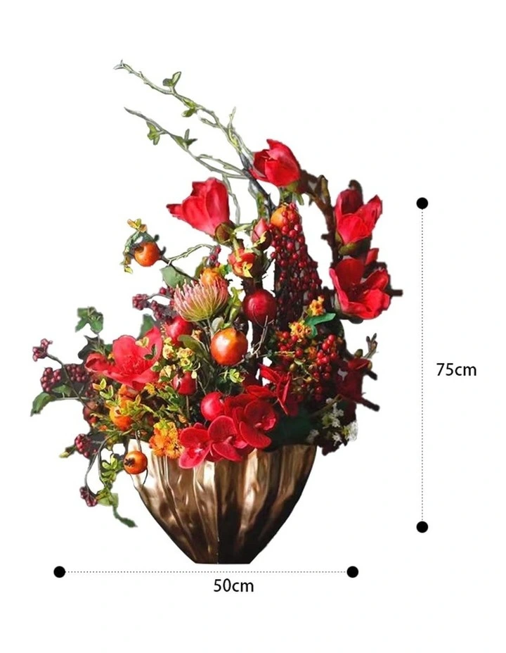 Exclusive Vicky Yao Faux Floral Bespoken Luxury Fire Red Festival Statement Floral Arrangement in Golden Pot. The Arrangement is about 50CM in Width and 75CM in height. It has various types of flowers with different shapes and textures gradually building into a triangle look. This is an absolutely stunning artistic arrangement sure to make a statement to your venue. It will take more than 7 days to dispatch due to bespoke.